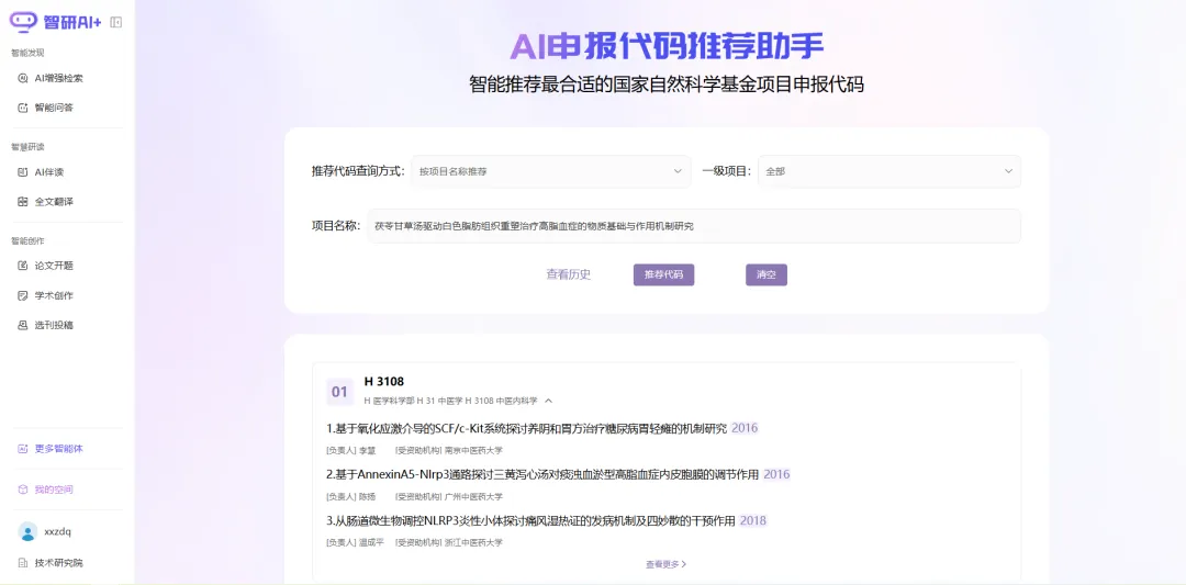 基于历史高质量科研项目的代码匹配规律,一键生成申报代码建议。