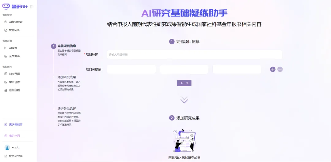 智研聚焦国家社科基金项目申报书及课题论证活页中的“研究基础”部分,依托其科研项目与科技成果资源等科技资源,融合AI,研发了“AI研究基础凝练助手”。该工具基于智研的海量学术资源与国家社科科研项目知识库、国家社科科研成果知识库,运用智能语义分析等技术,对用户检索或上传的科研成果进行系统分析与提炼,从核心思想、理论主张、研究方法等方面进行结构化归纳,并结合拟申报项目的研究方向与理论框架,智能生成前期相关代表性研究成果对拟申报项目的学术递进关系,为申请人提供科学、系统的研究基础梳理与论证支持。