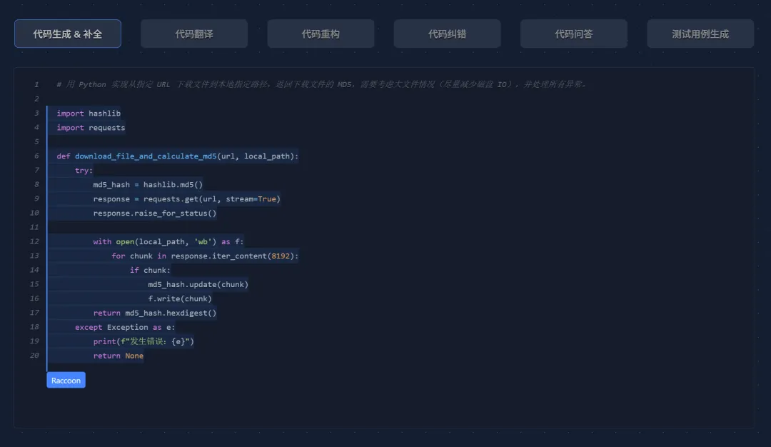 「代码小浣熊」是基于商汤大语言模型的软件智能研发助手,覆盖软件需求分析、架构设计、代码编写、软件测试等环节,满足用户代码编写、编程学习等各类需求。