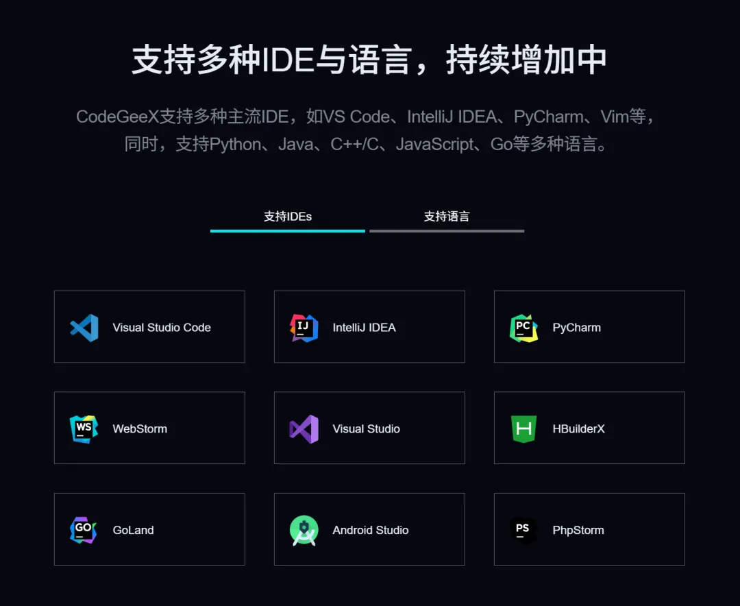 CodeGeeX支持多种主流IDE,如VS Code、IntelliJ IDEA、PyCharm、Vim等,同时,支持Python、Java、C++/C、JavaScript、Go等多种语言。