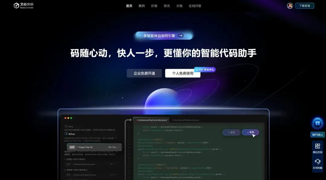 采用百度自研的文心代码大模型作为核心引擎,同时灵活支持接入 DeepSeek、ChatGLM、Kimi 等业界优秀的开源模型 - AI IDE: