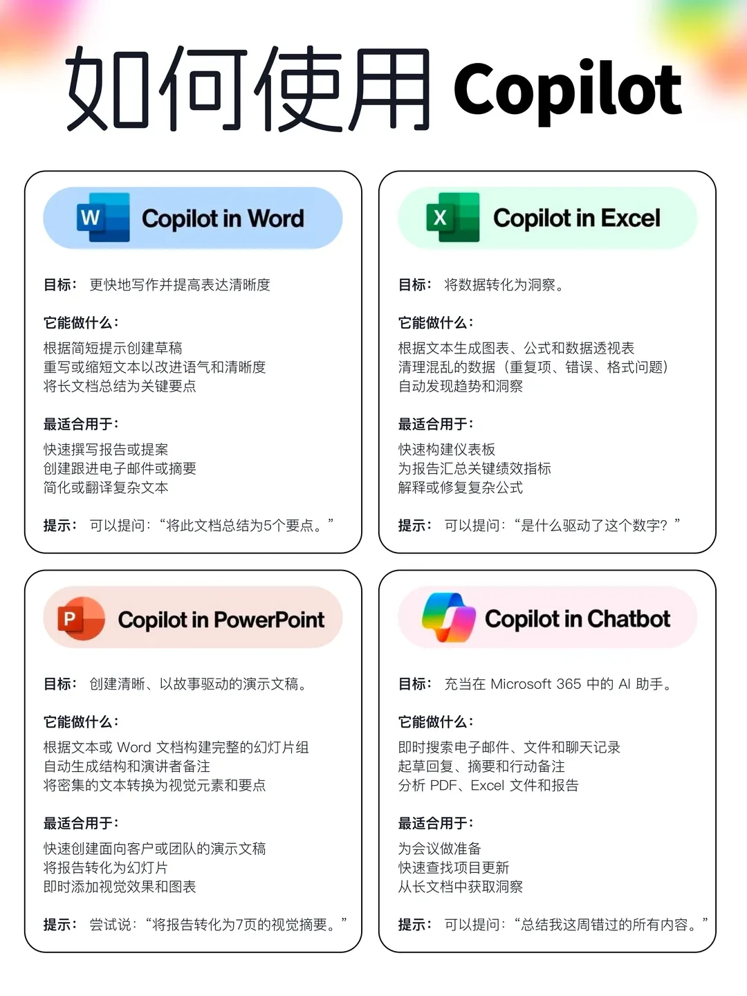 ✅ 快速上手:打开PPT→顶部“开始”选项卡找到Copilot(首次使用可在“帮助”菜单激活)→输入具体指令→根据AI建议微调→完成制作。