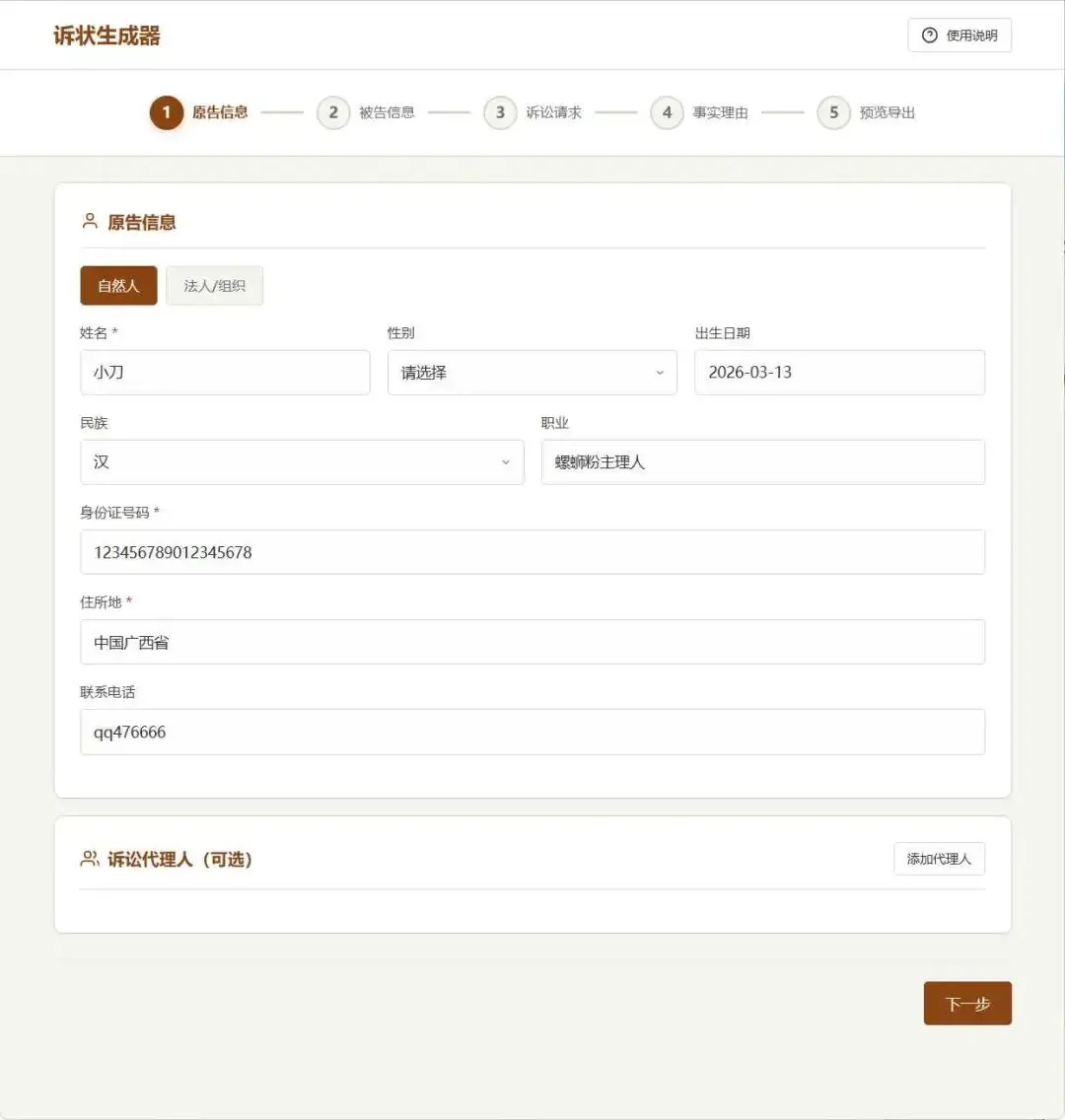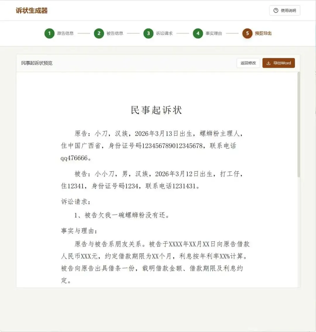 一款免费、简洁的民事起诉状辅助生成工具。只需几步简单填写即可自动生成格式标准起诉状文书,支持一键导出Word文件。完全本地运行,无需注册,隐私安全。本工具特别适合一般简单的民事案件(如民间借贷、买卖合同欠款、物业费纠纷、简单劳动报酬追索、离婚抚养费等),能帮助您快速生成规范诉状。