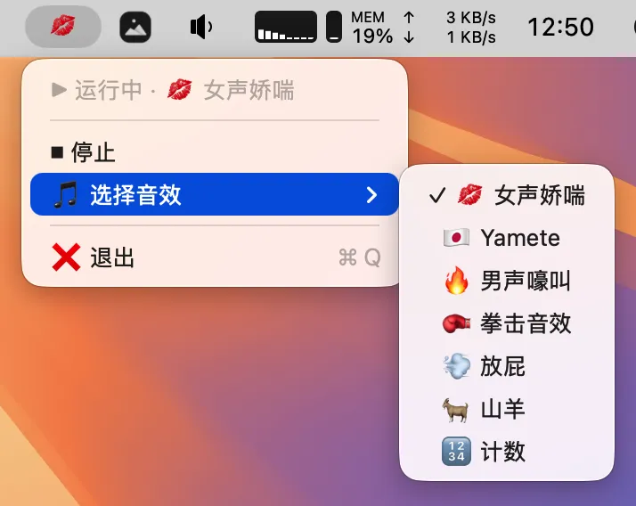 – 图标会随音效变化(💋🔥🥊💨🐐🔢)