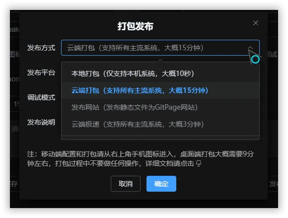 到了一步 是不是很快 溯光笔记 建议 如果你是打包exe 电脑用 那么就可以选本地打包模式