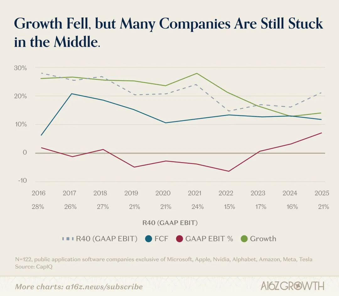 导读:这篇文章来自 a16z,作者 David George 的核心判断很直接:软件行业那段既不够快、也不够赚的“舒服中间地带”已经结束了。未来 12 到 18 个月,软件公司基本只剩两条路,要么用真正新的 AI 产品把增长重新拉起来,要么把真实经营利润率做到 40% 以上。