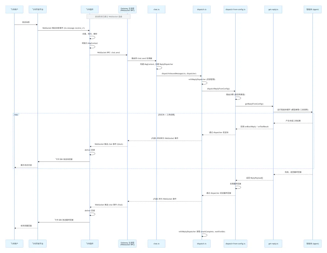 下面用 Mermaid 序列图完整展示从飞书用户发送消息到收到回复的全过程,包括插件内部、Gateway 内部的关键节点。