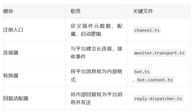 整个架构可以概括为:插件接收消息 → 通过 WebSocket RPC 发送给 Gateway → Gateway 调度智能体处理 → 回复通过同一 WebSocket 连接推回插件 → 插件发送到平台。