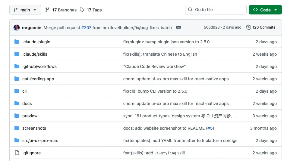 而且它并不只服务某一个工具链。按照项目 README,目前它支持用 CLI 安装到一串主流 AI 编程工具里,包括 Claude Code、Cursor、Windsurf、Codex CLI、Gemini CLI、Continue 等;另外像 GitHub Copilot、Kiro、Roo Code 这些也有对应方式接入。安装本身也不复杂,官方推荐直接用 uipro-cli,一条命令初始化到指定助手里。