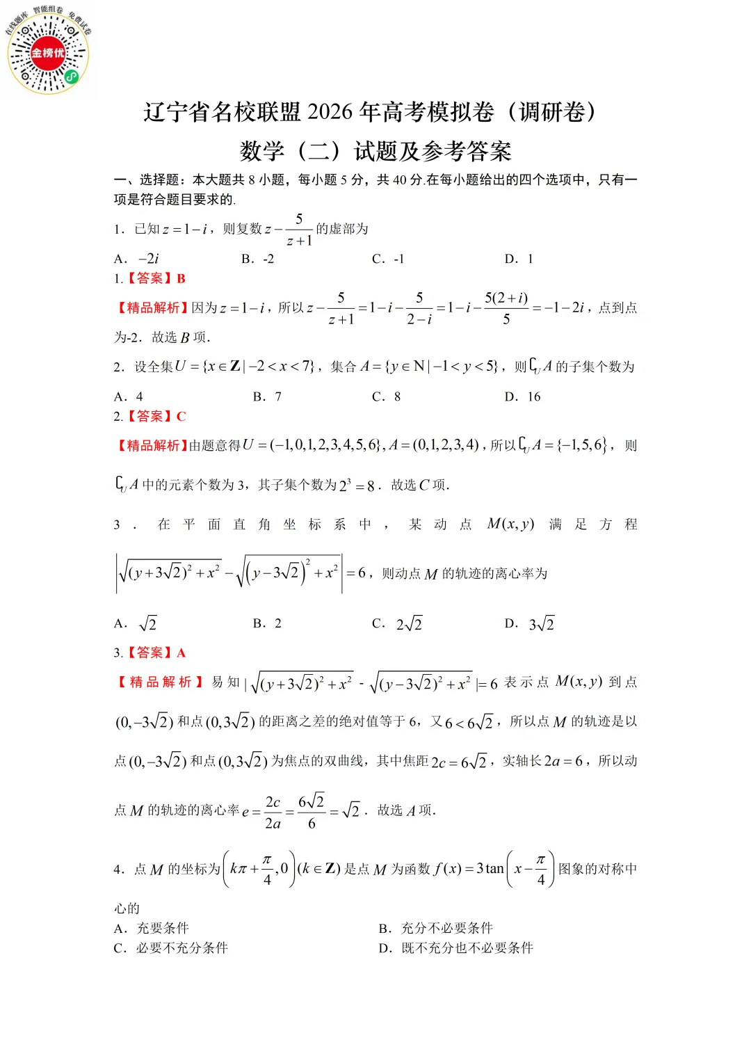 【精品word版】辽宁名校联盟2026届高考模拟(调研卷) 数学(二)试题+答案