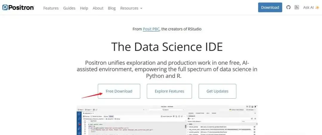 直接搜索Positron官网:https://positron.posit.co/ ,进入之后点击「Free Download」,之后按照正常的软件安装流程即可。