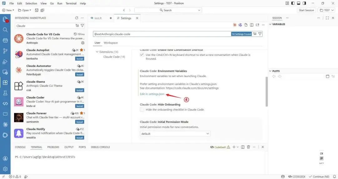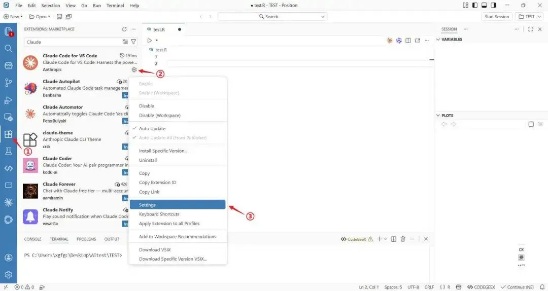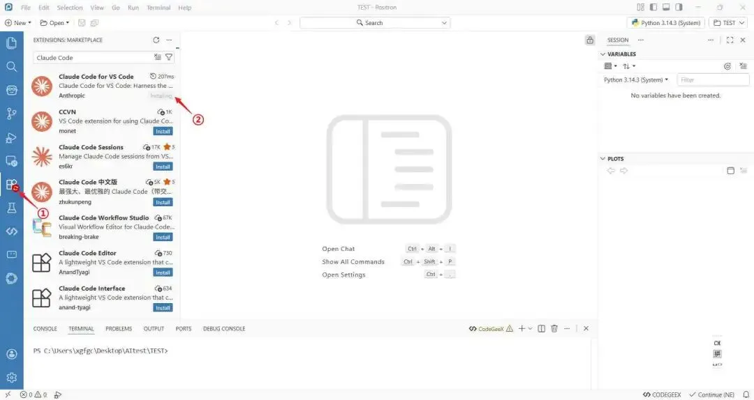 完成STEP 1之后,打开Positron,找到图中所示①「Extensions」,搜索Claude Code。选择图中所示②「Claude Code for VS Code」,点击「Install」