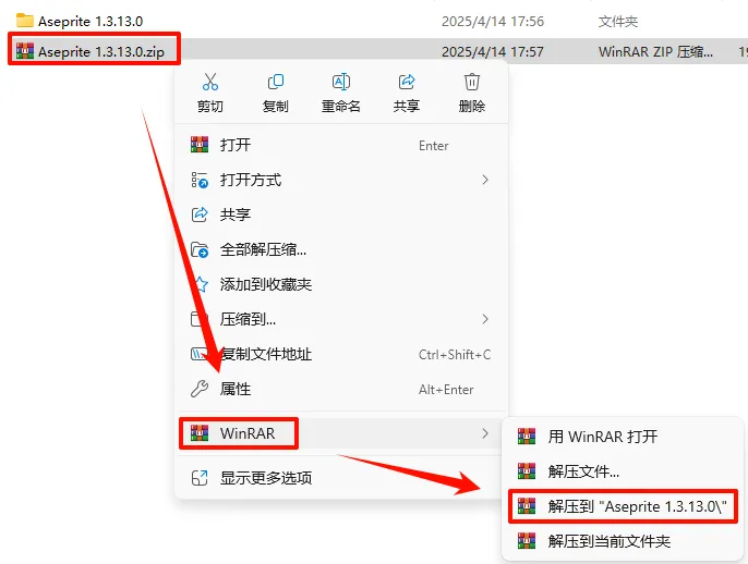 1.选中下载的压缩包,然后鼠标右键选择解压到“Aseprite 1.3.13.0”(没有解压选项点这里)