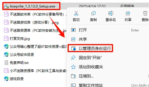 2.打开刚刚解压的文件夹,鼠标右键点击“Aseprite_1.3.13.0_Setup.exe”选择“以管理员身份运行”