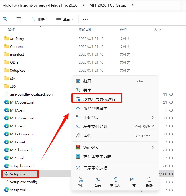 2.打开刚刚解压的文件夹,双击打开“MFI_2026_FCS_Setup”文件夹,选中“Setup.exe”文件,鼠标右键选择“以管理员身份运行”