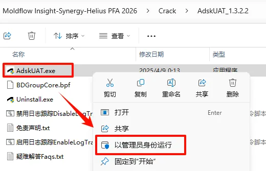 8.返回之前解压的“Moldflow Insight-Synergy-Helius PFA 2026”文件夹,依次打开“Crack——AdskUAT_1.3.2.2”文件夹,选中“AdskUAT.exe”文件,鼠标右键选择“以管理员身份运行”