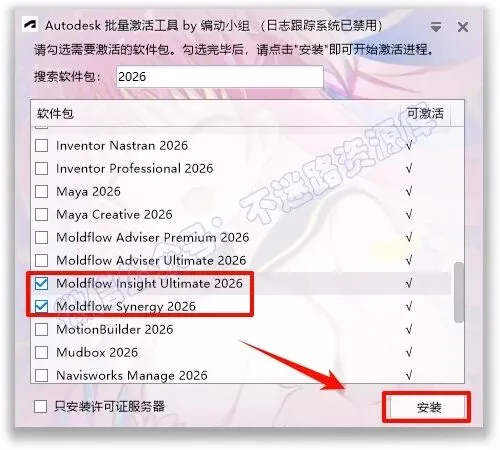 9.根据安装的软件勾选相应的项,教程这里勾选“Moldflow Insight Ultimate 2026”和”Moldflow Synergy 2026″,点击“安装”