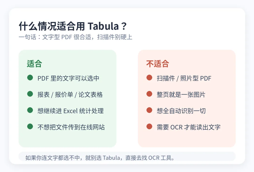 ⚠️ 如果你处理的主要是截图、照片、扫描版 PDF,那应该去找 OCR 工具,不该选 Tabula。