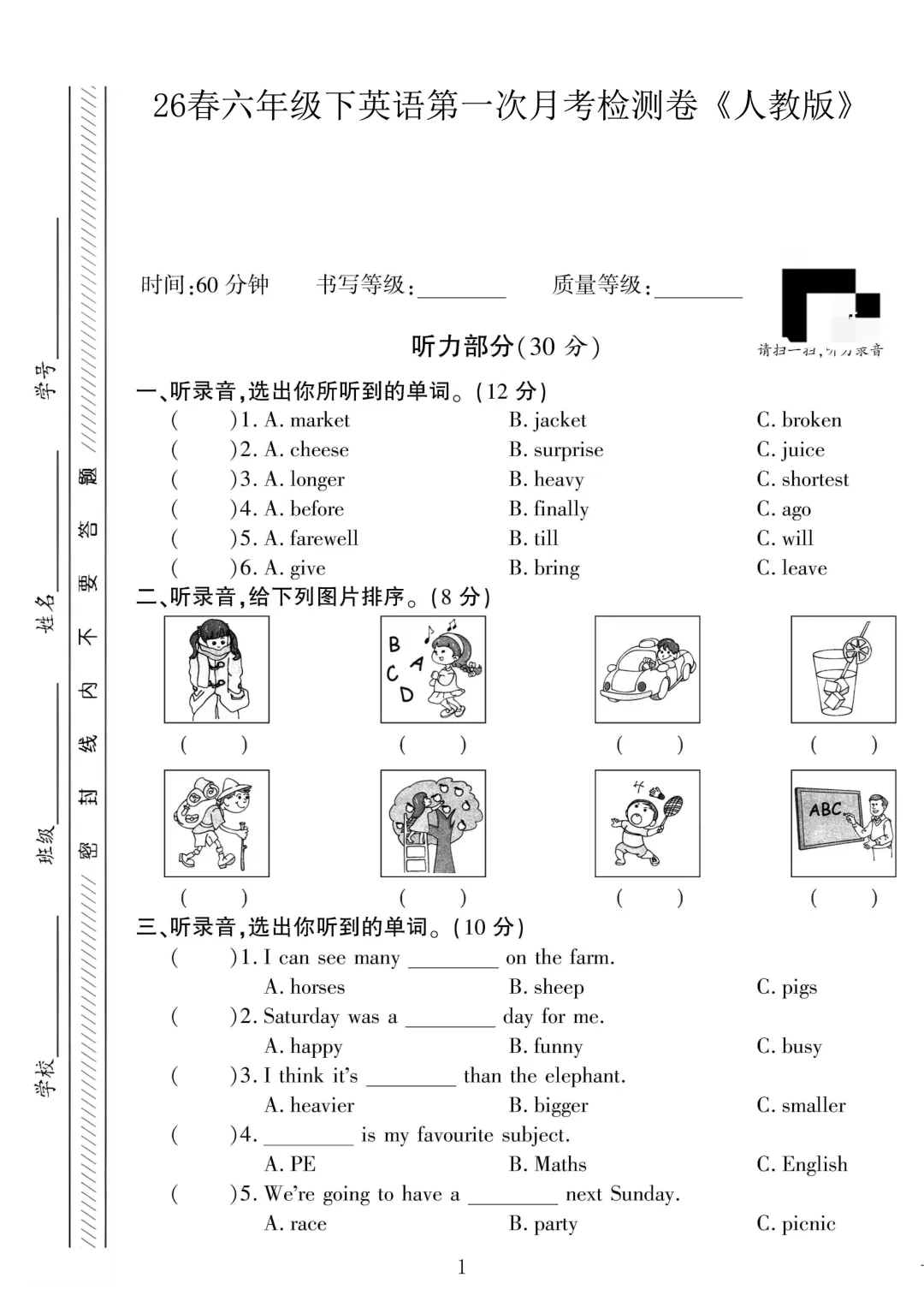 六年级下册作为小学英语收官阶段,学习节奏紧、考点综合性强,第一次月考既是对开学以来学习成果的全面检测,也是查漏补缺、调整备考节奏的关键时机。2026春人教PEP版小学六年级下册英语第一次月考测试卷,同步课堂教学进度,紧贴校内月考命题风格,精准匹配考点与难度,专为六年级学子量身打造,助力孩子吃透重难点、熟悉考试题型,从容迎战首次月考,稳住学习节奏,为小升初英语备考打好开篇基础。