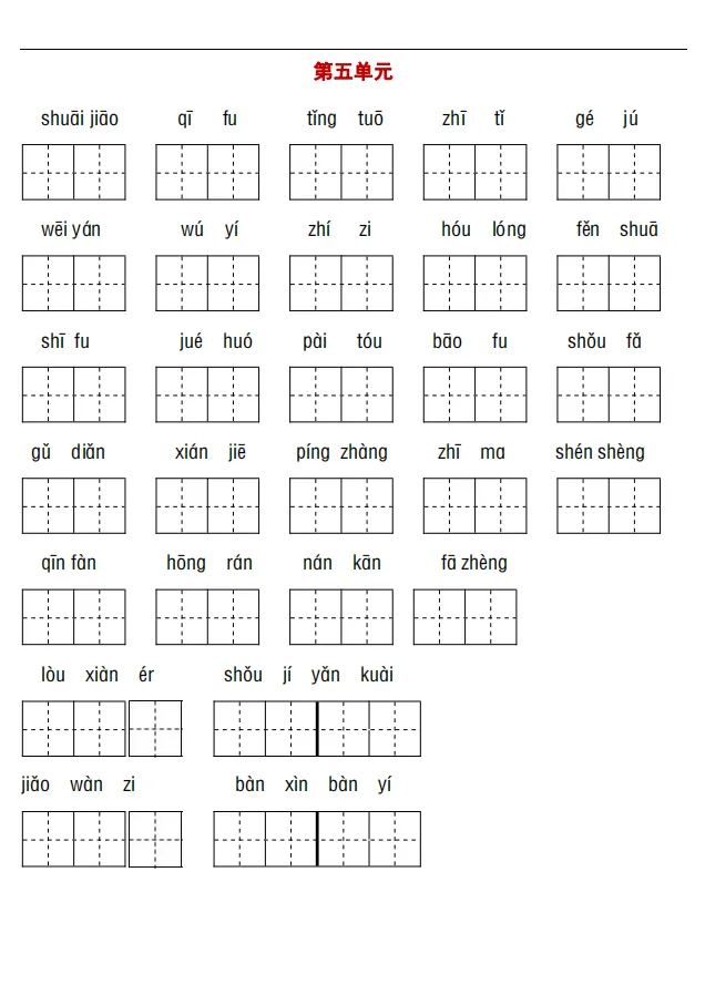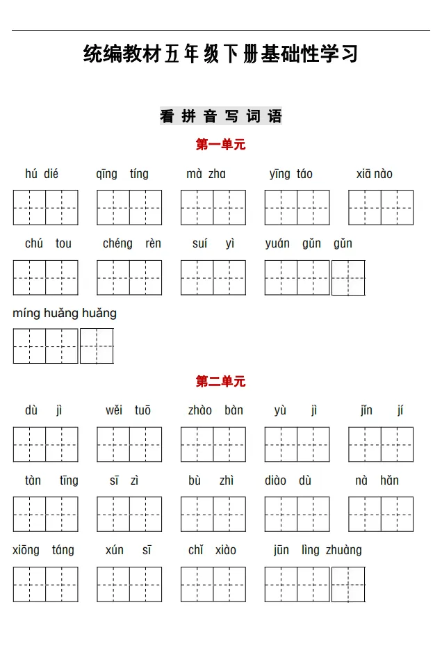 老师给大家整理了部(统)编版五年级语文下册全册看拼音写词语练习,有需要的家长,可以打印给孩子学习!