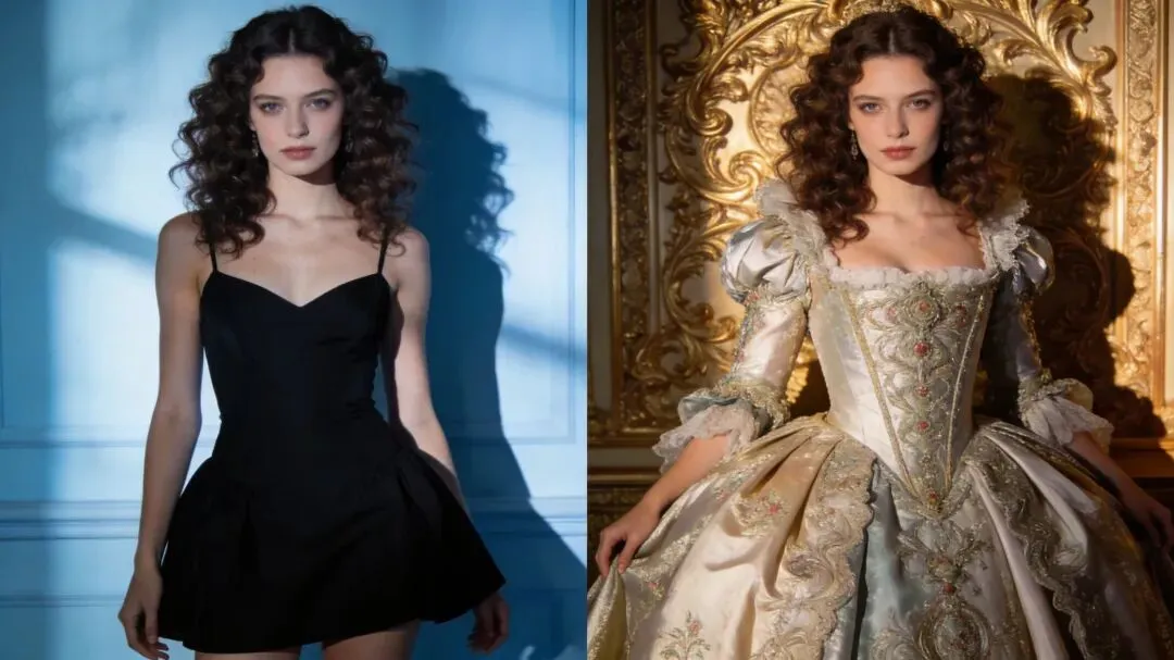 提示词:图中女生穿着华丽的宫廷礼服