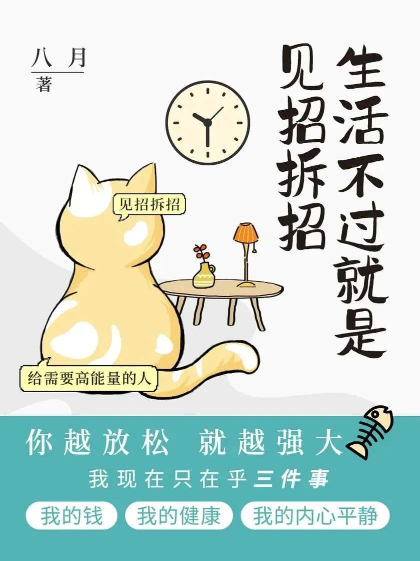 你越放松,就越强大。 我现在只在乎三件事:我的钱,我的健康,我的内心平静。 《生活不过就是见招拆招》作者八月通过44篇关于职场、生活、成长与爱的正能量故事,既是鼓励也是安抚每一个年轻人:年轻人不够好又有什么关系,只要找到心中的方向, 把握好自己的节奏,脚踏实地的往前走,你想要的都会到来。我们还年轻,不够好又有什么关系?重要的是我们一直在努力! 《生活不过就是见招拆招》语录 我们真是活得太贪心了,我们想要过上好的生活,想要成为好的人,还想要得到好的爱。 有时候面对生活,我们也可以选择,只是我们缺乏选择去做自己的那份魄力。我们害怕的与其说是太晚的开始,不如说是害怕面对未知的失败。所以,有些事情,我们只是想了想,还没付出行动,就认输了。