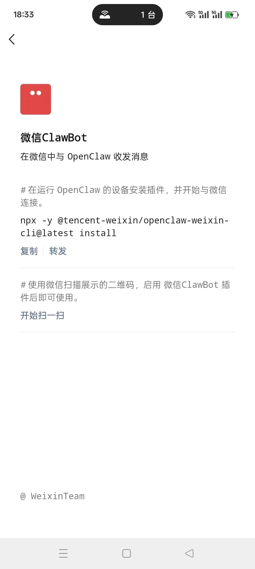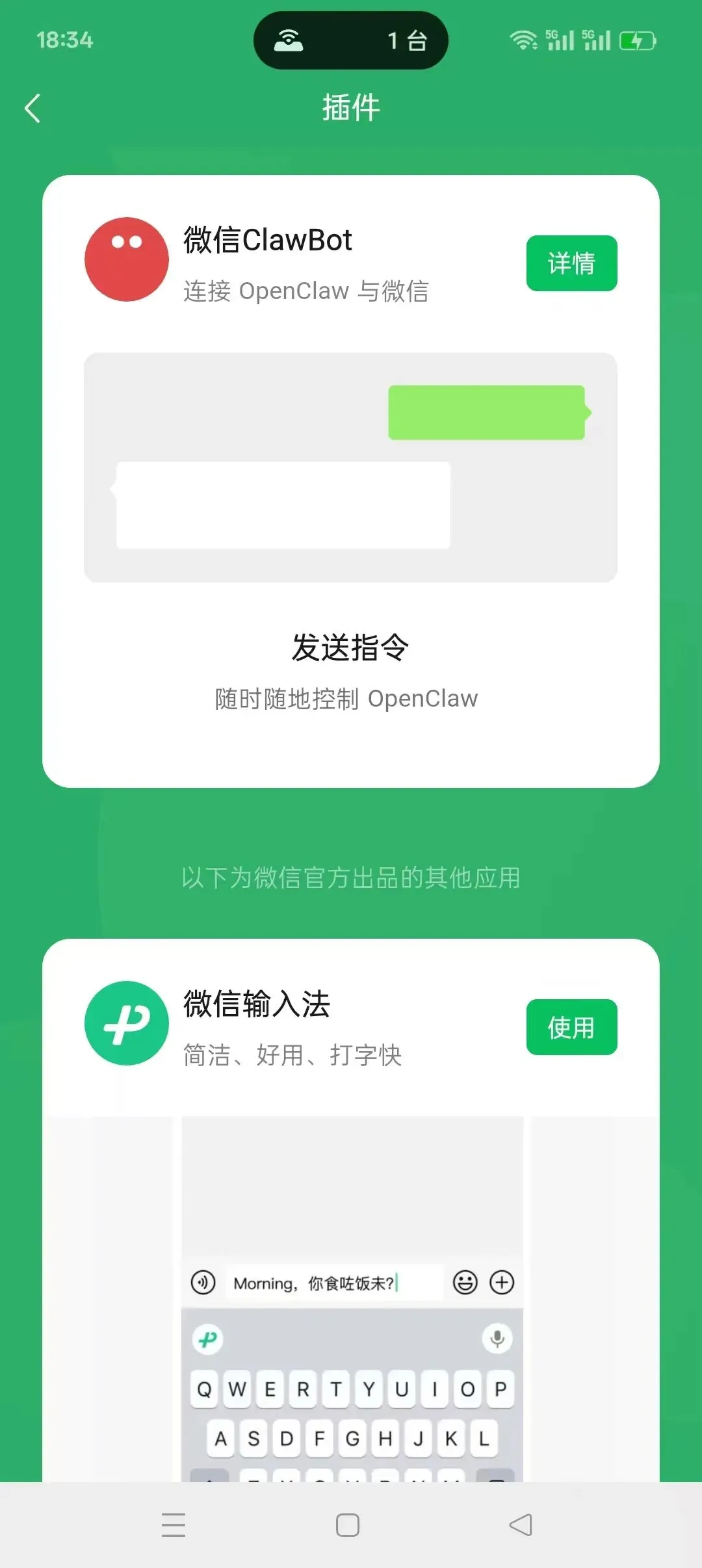微信的OpenClaw插件终于更新了 前几天时间各个公众号里面都「报道」的微信OpenClaw插件终于可以用了,不废话,直接上干货。 打开「微信」 -> 「我」 -> 「设置」 -> 「插件」 就能看到下图 点击「微信ClawBot」的【详情】就出现下图: 拷贝下面的命令,然后在命令行中执行: npx -y @tencent-weixin/openclaw-weixin-cli@latest install 执行结果如下图: 然后就可以在微信中愉快地和OpenClaw对话了: