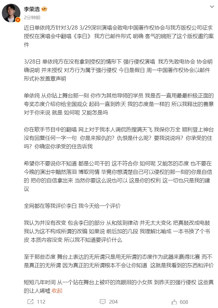 李荣浩称:“近日,单依纯方针对3月28、3月29深圳演唱会致电中国著作权协会与我方版权公司征求授权在演唱会中翻唱《李白》,我方已邮件形式,明确、客气的婉拒了这个版权邀约案件。3月28日,单依纯方在没有拿到授权的情形下,强行侵权演唱。我方先致电协会,协会明确说明,并未授权,对方行为属于强行侵权。今日是假日,周一中国著作权协会以邮件形式补发盖章声明。”李荣浩提到,单依纯在《歌手》节目中的翻唱,让网上对于自己的调侃热搜满天飞 。