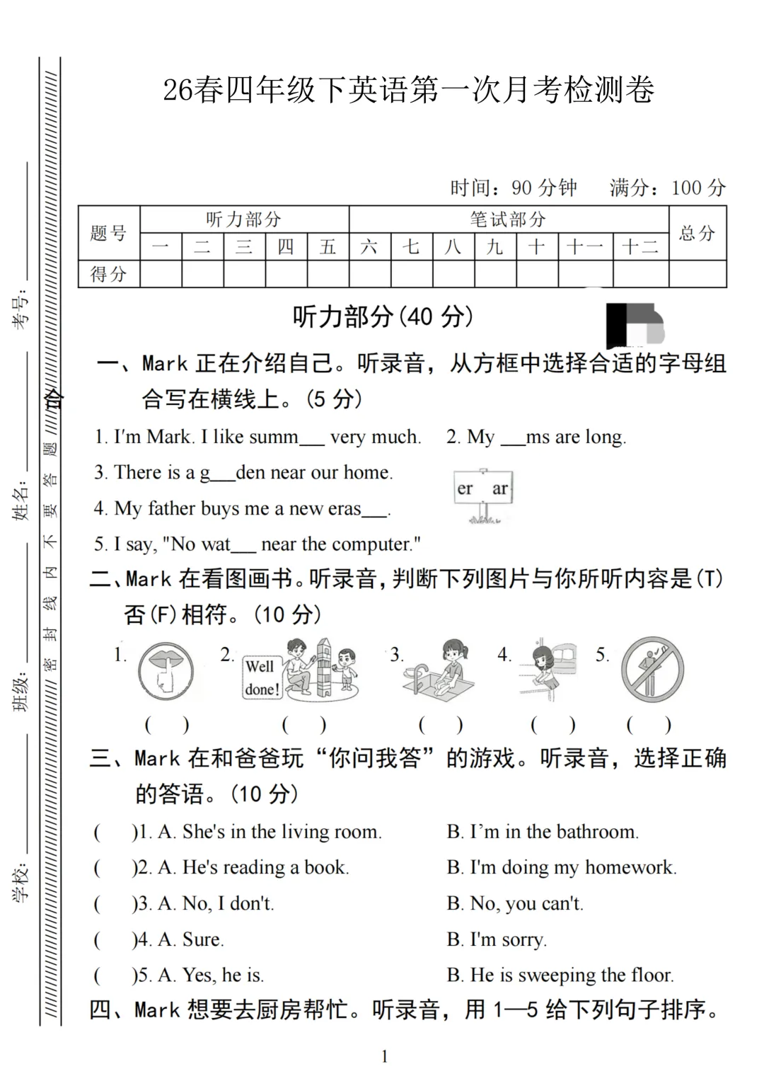 新学期英语学习步入正轨,第一次月考是检验学习成效、排查知识漏洞、调整学习节奏的关键,贴合教材、对准考情,才能高效备考、从容应考。2026春人教PEP版小学四年级下册英语第一次月考测试卷,同步课堂教学进度,紧贴校内月考命题风格,精准匹配考点难度,专为四年级学子打造,助力孩子夯实基础、熟悉考法,轻松迎战首次月考,拿下开门红。