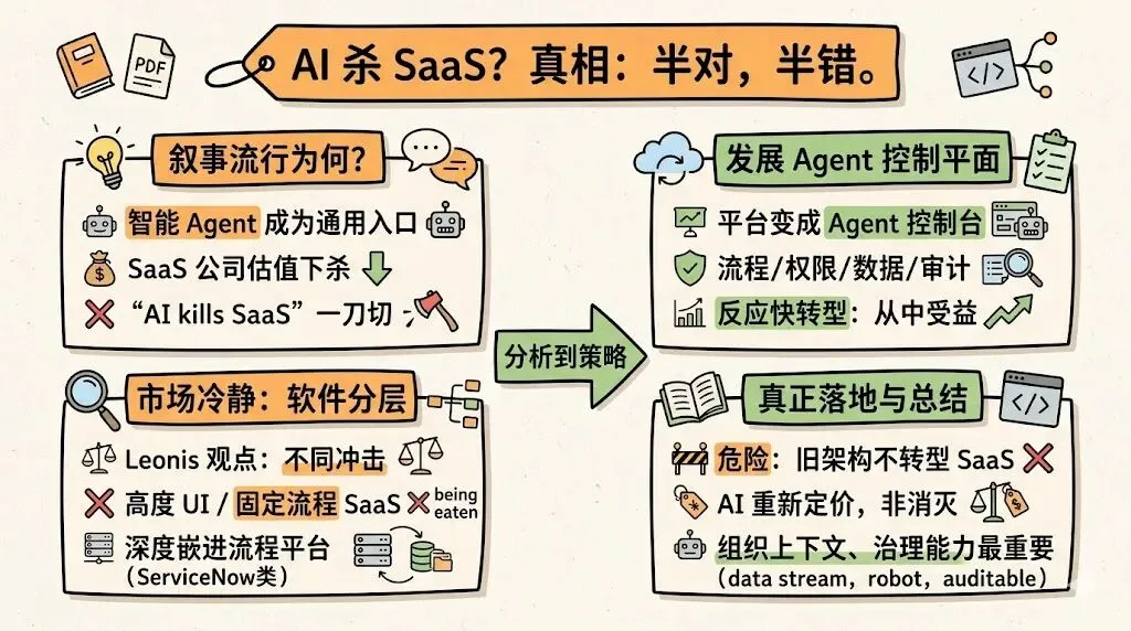 原因也不复杂。很多人担心,智能 Agent 最后会成为通用入口,大家不再需要专门的应用界面。这种情绪其实早就反映在资本市场里了:不少 SaaS 公司估值下杀,有分析师干脆直接喊出 “AI kills SaaS” 或者 “Agents replace software”。