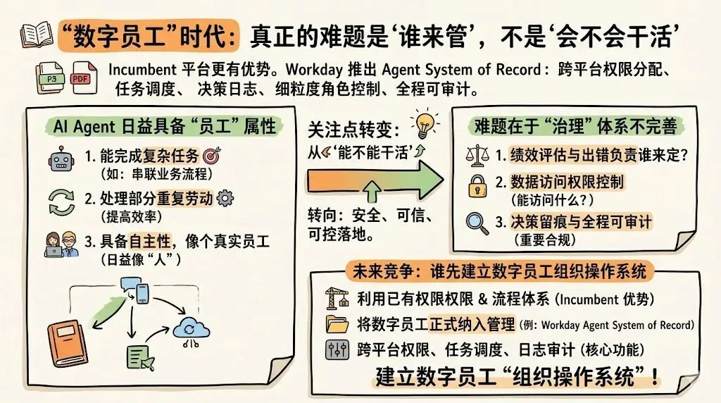 这些数字员工谁来管?它们的绩效怎么评估?它们出错了谁负责?它们能访问什么数据、不能碰什么数据?它们做出的决策怎么留痕、怎么审计、怎么回滚?