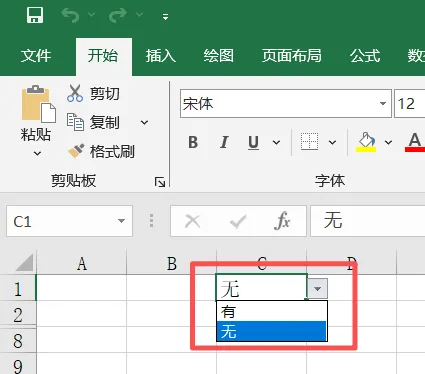 勾选【提供下拉箭头】,点击【确定】此时 C2单元格就有了 “有 / 无” 的下拉选择功能。