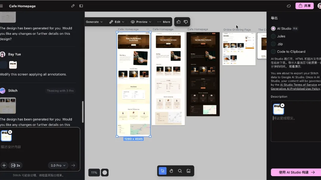 以前的Stitch,只能一屏一屏生成界面,页面之间互相独立,想法、参考、原型、交付散落在不同的窗口和工具里,来回切换繁琐又割裂。