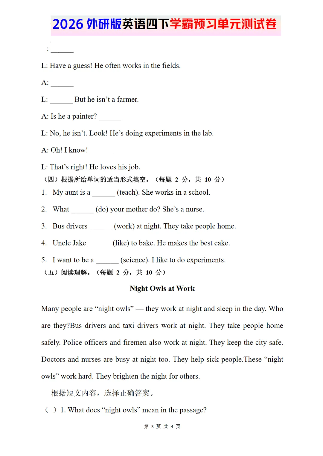【免费下载】2026外研四下英语试卷 Unit 1PDF高清电子版,可打印,先保存后