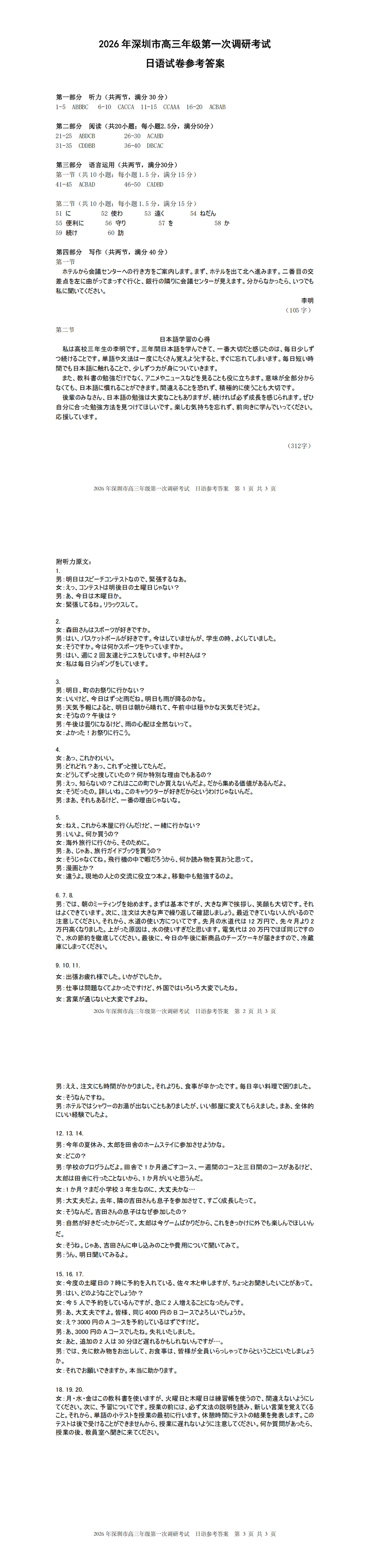 【深圳一模】解析!WORD·2026年广东深圳市高三第一次调研考试日语试卷(作文:路线说明;日本語学習の心得)+听力+答案详解及听力原文 点击文章底部“阅读原文”即可免费下载(已解压WORD) 2026届广东深圳市高三年级下学期第一次调研考试日语试卷 答案及听力原文 答案解析 点击文章底部“阅读原文”即可免费下载(已解压WORD) 如需保存至百度网盘,复制以下内容 即可 链接:https://pan.quark.cn/s/bbd31cee8770 【广州一模】解析!WORD广东广州2026届高三3月日语试题(作文:邮件;エコ生活と私の責任)+答案详解及听力原文