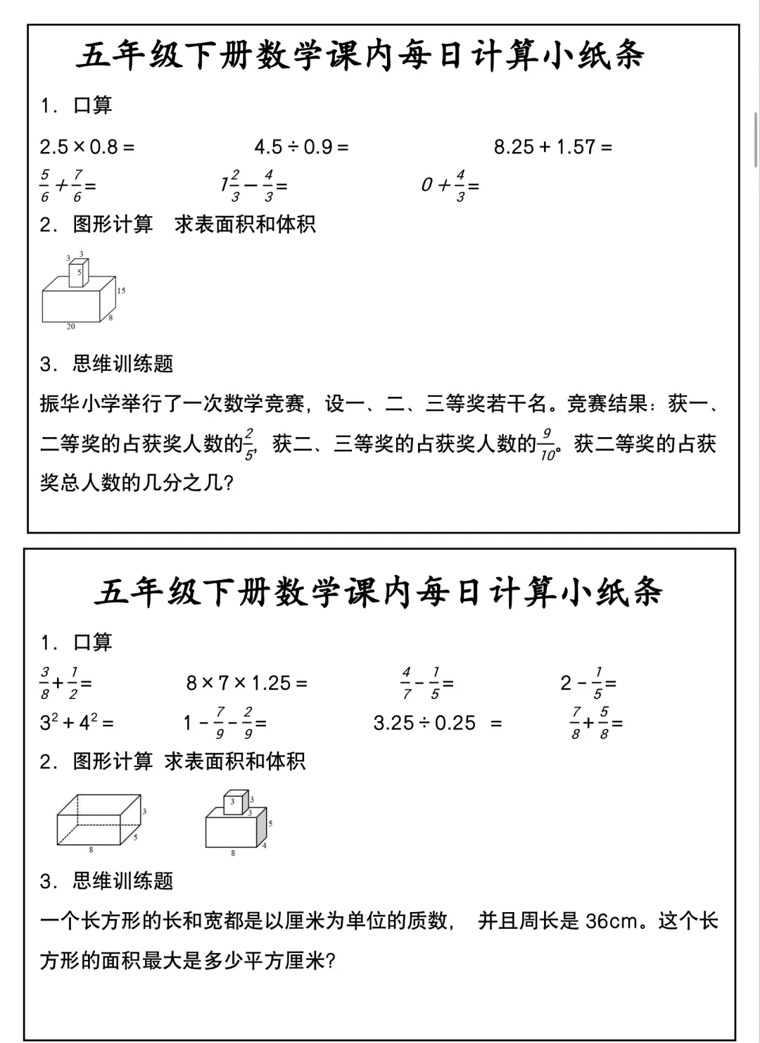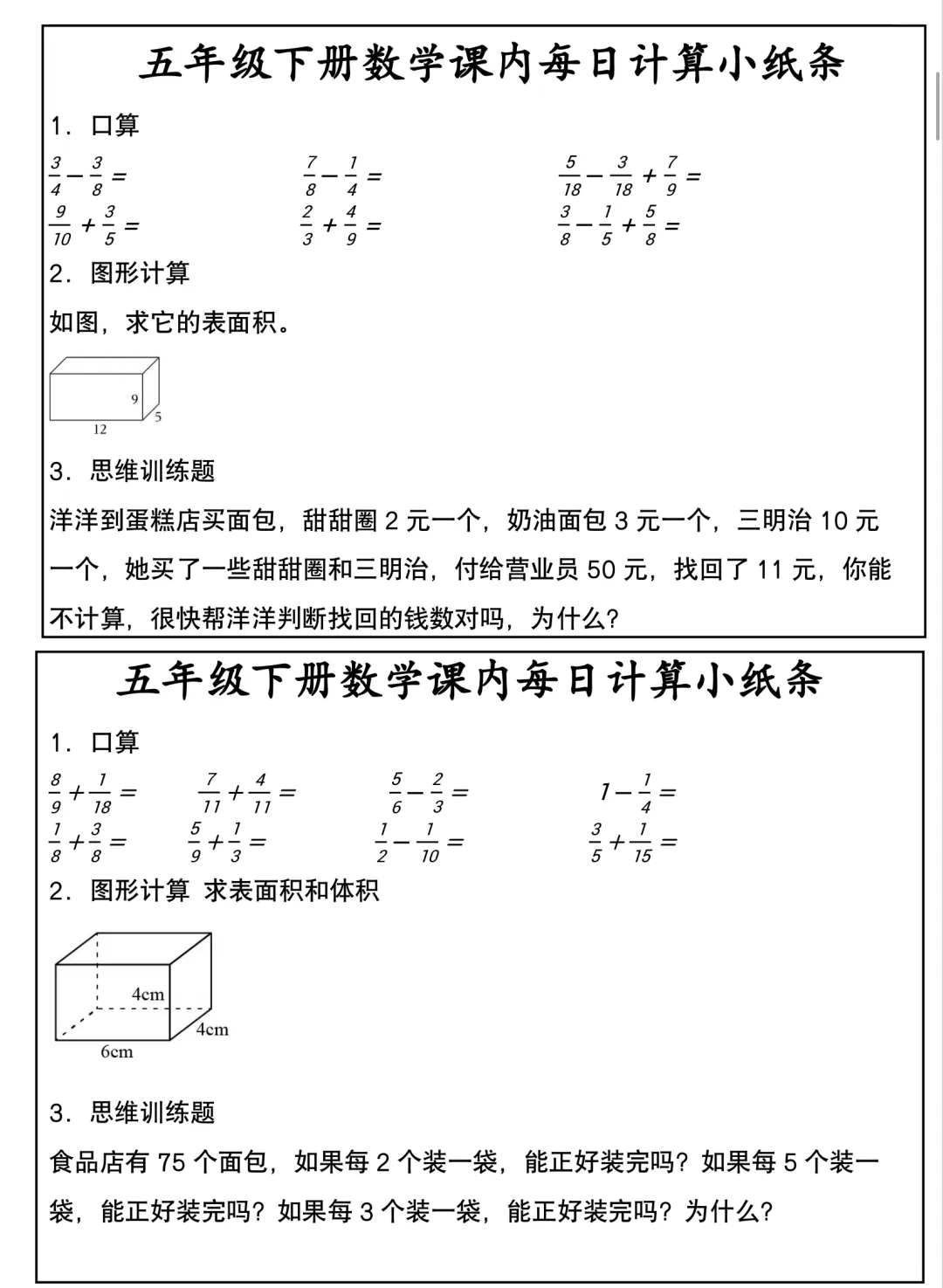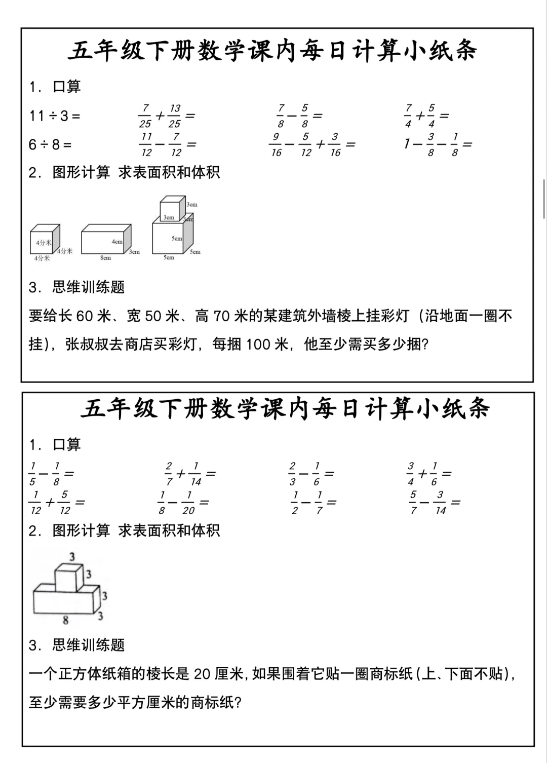 专为2026春五年级下册数学量身打造的课内同步每日计算小纸条,新鲜上线啦!✅ 完全贴合课本课内知识点,不用家长费心找题、排版,每天一小张,碎片时间就能练,轻松帮孩子夯实计算根基,稳拿数学基础分!