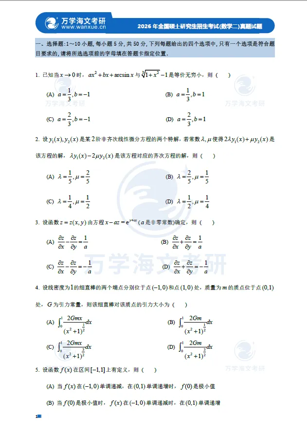 免费领真题:2026数学二真题+答案PDF完整版!