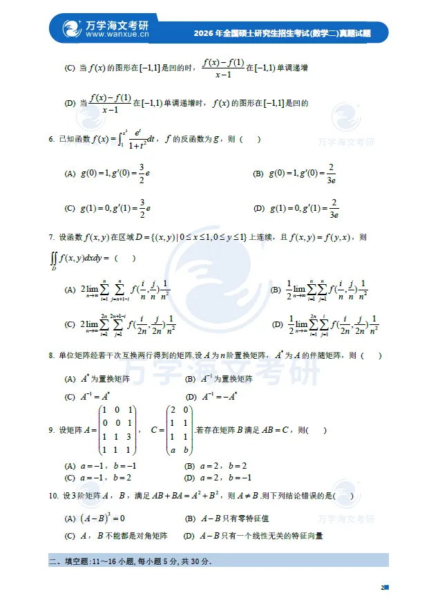 2026年硕士研究生数学二初试真题及答案解析为大家奉上