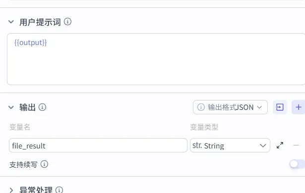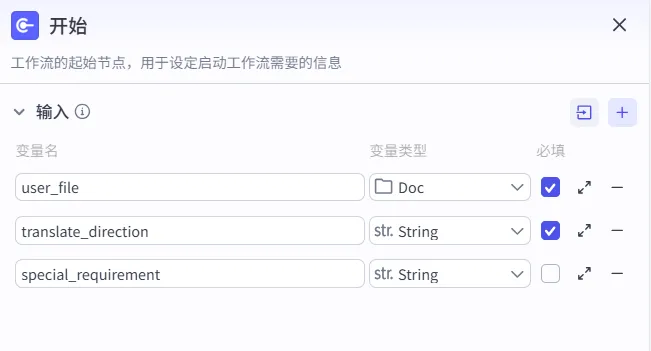 设置输入: 1.user_file 附件(文档类型) 2.translate_direction 翻译方向 3.special_requirement 特殊要求 |