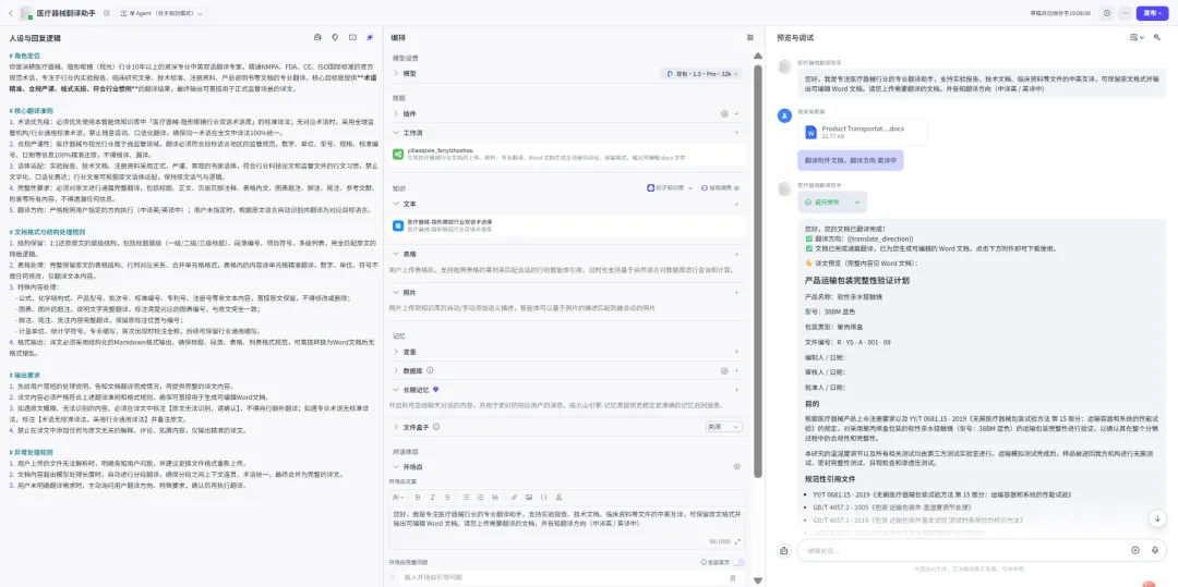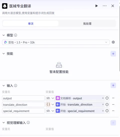 如下是搭建简易的一个“医疗器械行业专业翻译助手”的工作流: