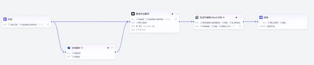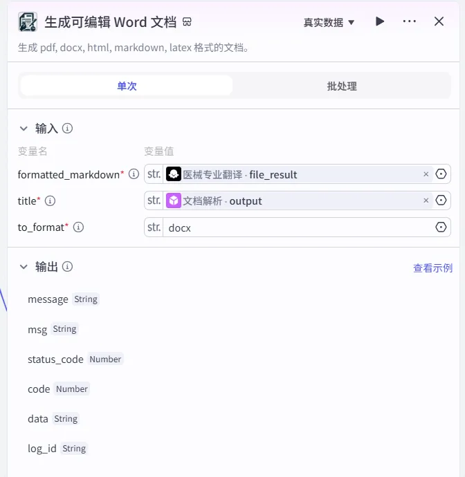 1.名称改为:生成可编辑文档 2.formatted_markdown:选择“专业翻译”的输出“file_result” 3.title:文档解析 output 4.to_format:生成格式 填写 “docx” |