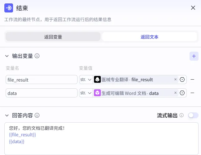 1.输出变量: 选择 专业翻译-file_result Data 生成可编辑文档 data(生成文档的链接) 2.回答内容: “您好,您的文档已翻译完成!” 按住Shift+{,分别增加选择 file_result 和 data |