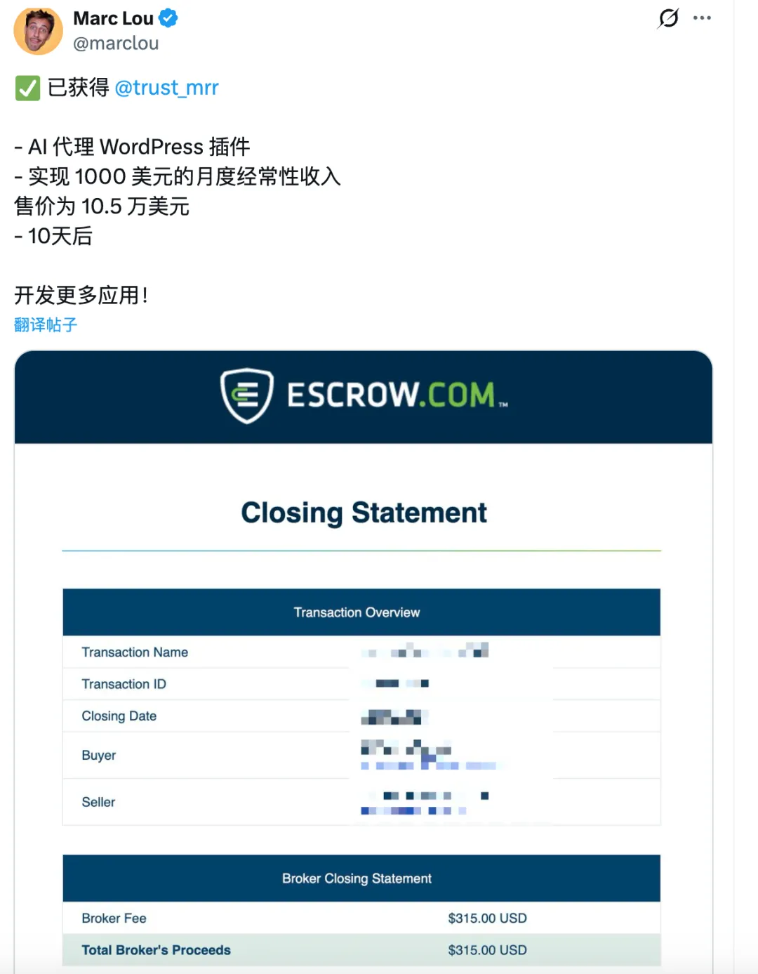 一个 WordPress 插件,月入1000美金,在 TrustMRR 上 10 天就以1万多美金成交了。