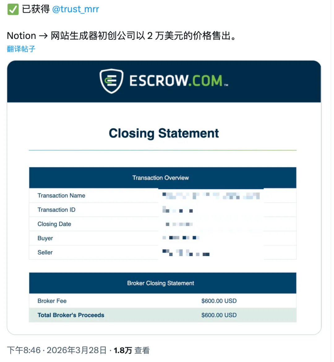后面有收益了,不想继续运营了,也可以直接卖掉,这个Notion上的网站生成器都卖了2万美金。