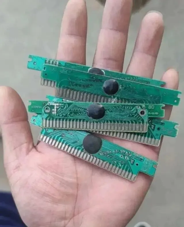 图里绿油油一长条,这个叫红白机游戏卡带主板,小时候家里谁能摸上一盘卡带可真是宝,一块薄薄的电路板,上头布满密密麻麻的线路,还有一小团黑色圆点,别看它不起眼,外头要再套个塑料外壳,这才叫完整一盘,插进红白机,电视一开,“咚咚咚”马里奥冒出来了,兄弟姐妹抢着玩,小朋友围着电视急得跺脚,就为了那几条命能不能通关,最怕卡带芯氧化了,机子识别不出来,嘴一哈气,袖口一擦,吹两下插回去,不吹不认,老玩家都这么鼓捣,谁家能带出去几盘卡带借换着玩,那地位一下起来了,刚认识的同学能直接成朋友。