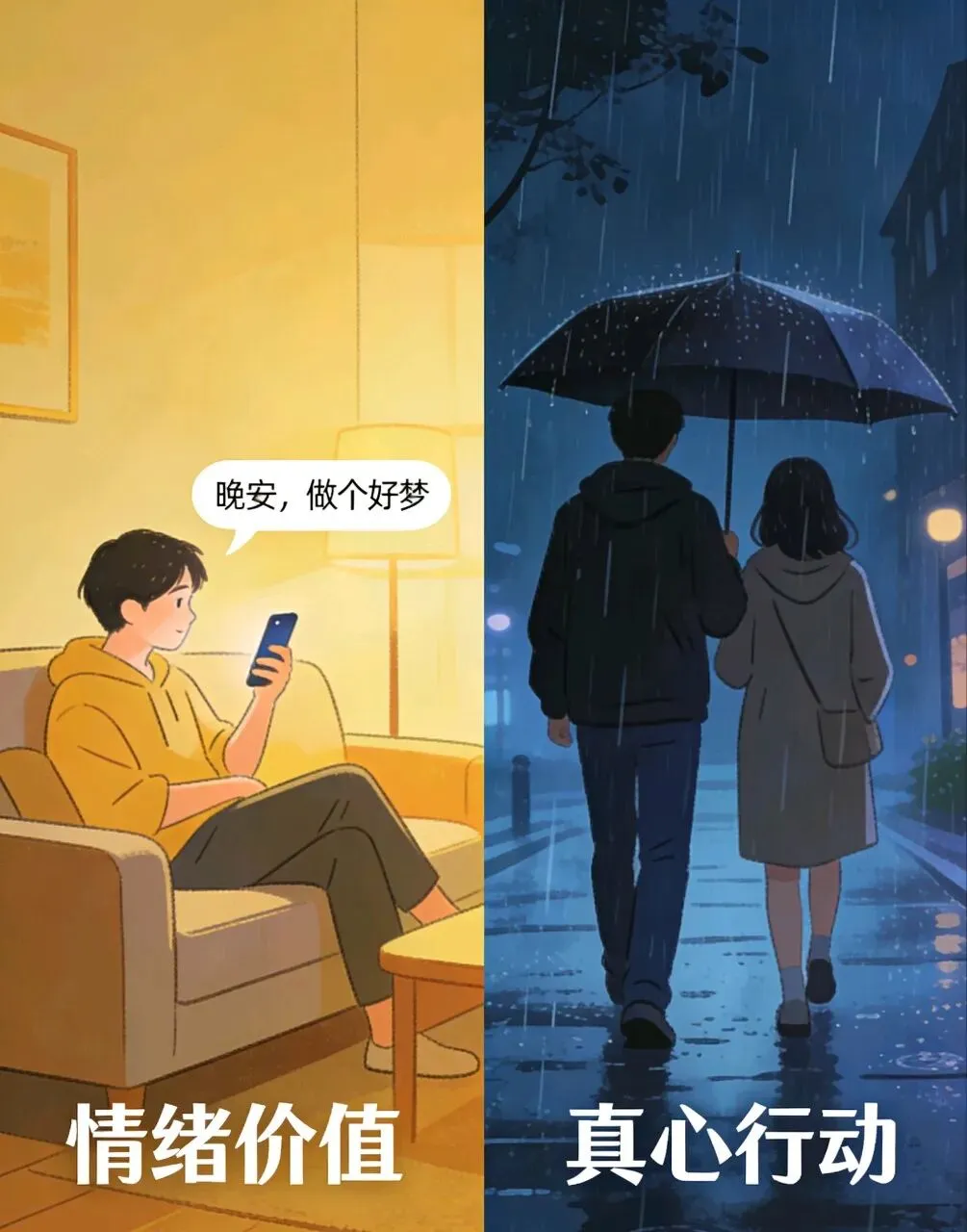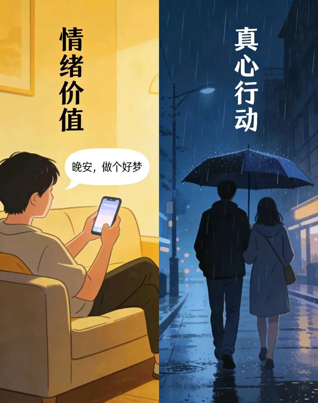 其次,爱从来是全方位的付出,而非单一的情绪安抚。真正的爱,藏在情绪的共鸣里,更藏在现实的担当中;是难过时的温柔陪伴,是困境时的挺身而出;是日常的细碎关怀,是风雨中的携手同行。一个只擅长提供情绪价值的人,或许能在你情绪低落时说尽甜言蜜语,却未必愿意在你遭遇实际困境时伸出援手;或许能包容你的小脾气,让你在情绪上倍感舒适,却未必愿意为你妥协退让,为你付出时间与精力。而有些不善言辞的人,不懂如何精准表达情绪,不会说漂亮的安慰话,却会在你加班晚归时默默留一盏灯,在你生病时笨拙地熬制热粥,在你迷茫时坚定地站在你身边。他们的爱没有华丽的情绪包装,却用实打实的行动、日复一日的守护,诠释着最质朴的真诚。对比之下便知,情绪价值只是爱的“锦上花”,而非“雪中炭”,不能仅凭情绪安抚,就判定一份爱的重量。