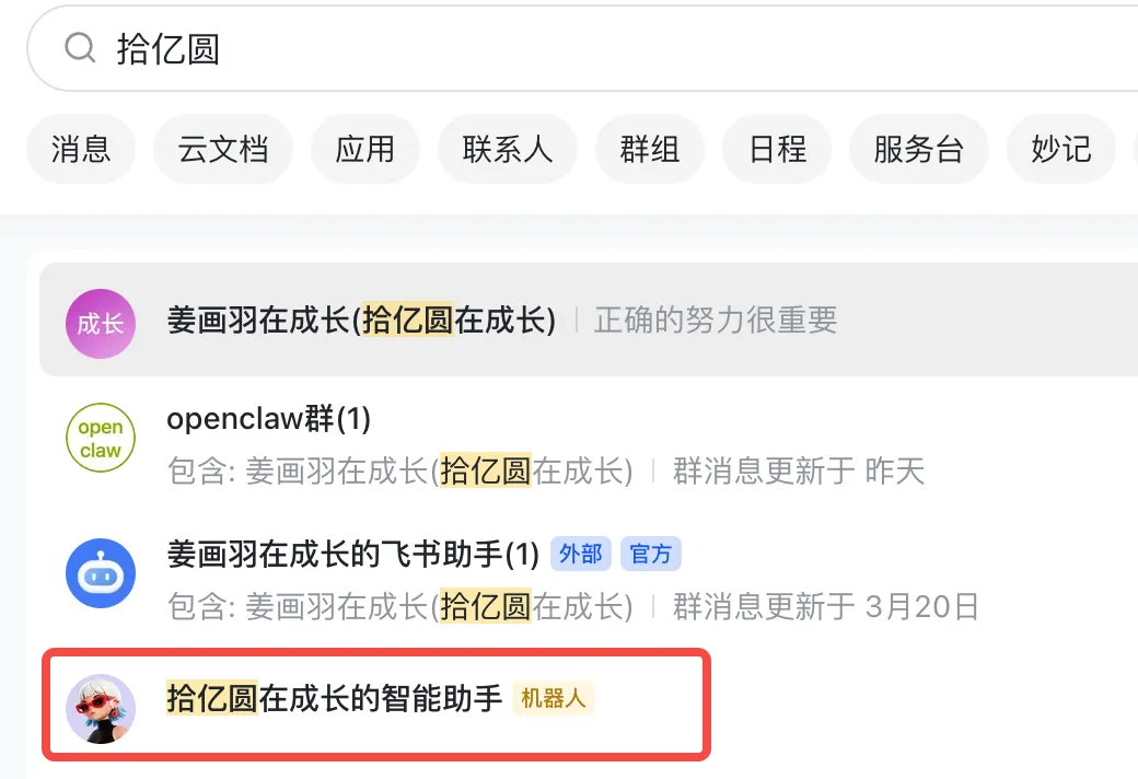 在飞书搜索你的机器人名称: