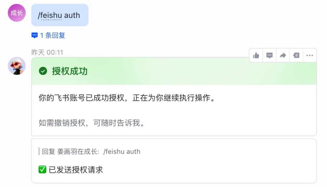 进入聊天,先发送 /feishu auth 授权,傻瓜式操作: