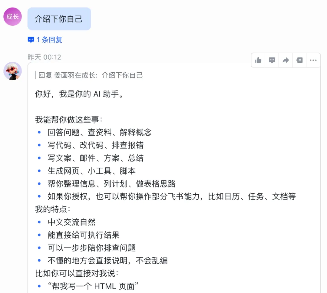完成前面的步骤之后,可以与飞书机器人进行单独聊天,或者将飞书机器人添加进群聊。