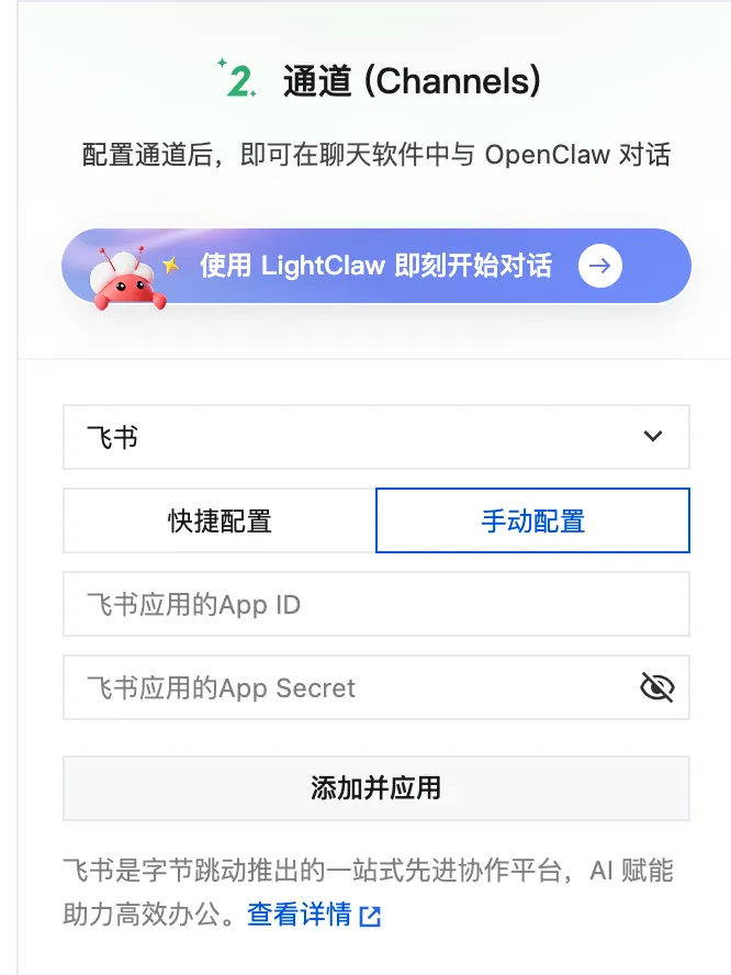 6 通道配置(配置飞书机器人App ID和App Secret)